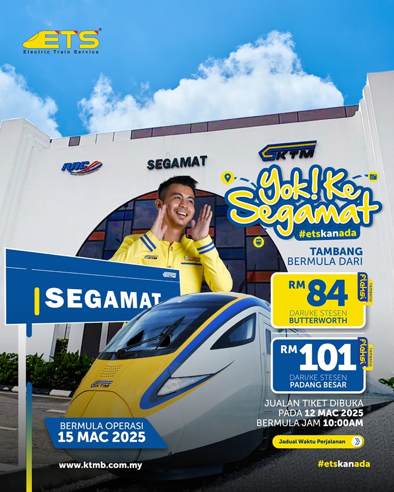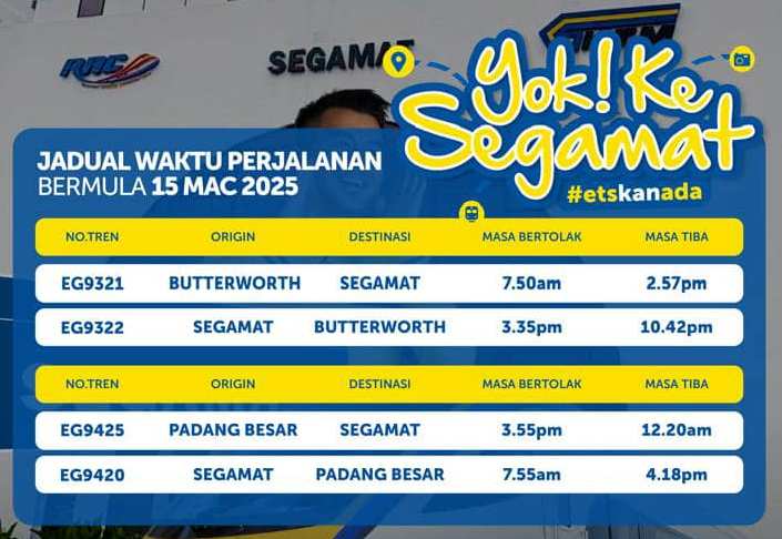 KUALA LUMPUR, 11 Mac 2025 – Keretapi Tanah Melayu Berhad (KTMB) memaklumkan bahawa mulai 15 Mac 2025, empat perkhidmatan tren elektrik (ETS) akan dilanjutkan ke Stesen Segamat, Johor.