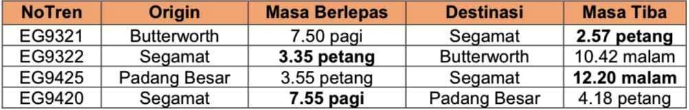 “Selain itu, penumpang juga boleh membuat perjalanan dari KL Sentral – Segamat dengan kadar tambang bermula dari RM34 sehala.