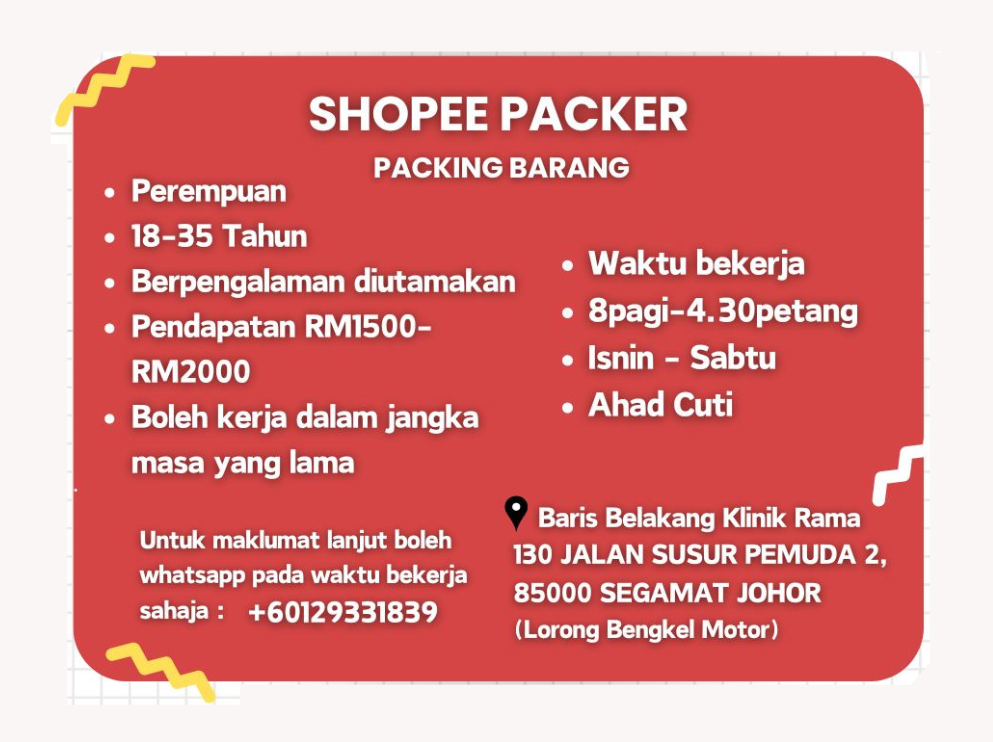 - Bayaran berdasarkan bilangan barang yang dibungkus. (Pendapatan lumayan boleh mencecah sebulan RM1500-RM2000)